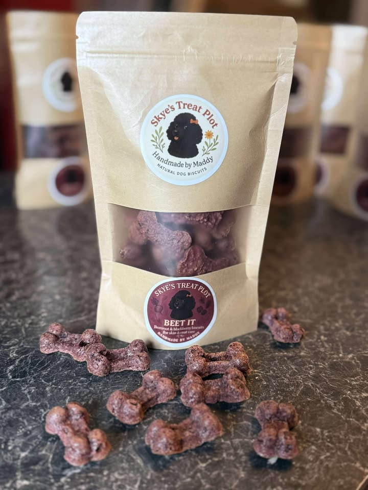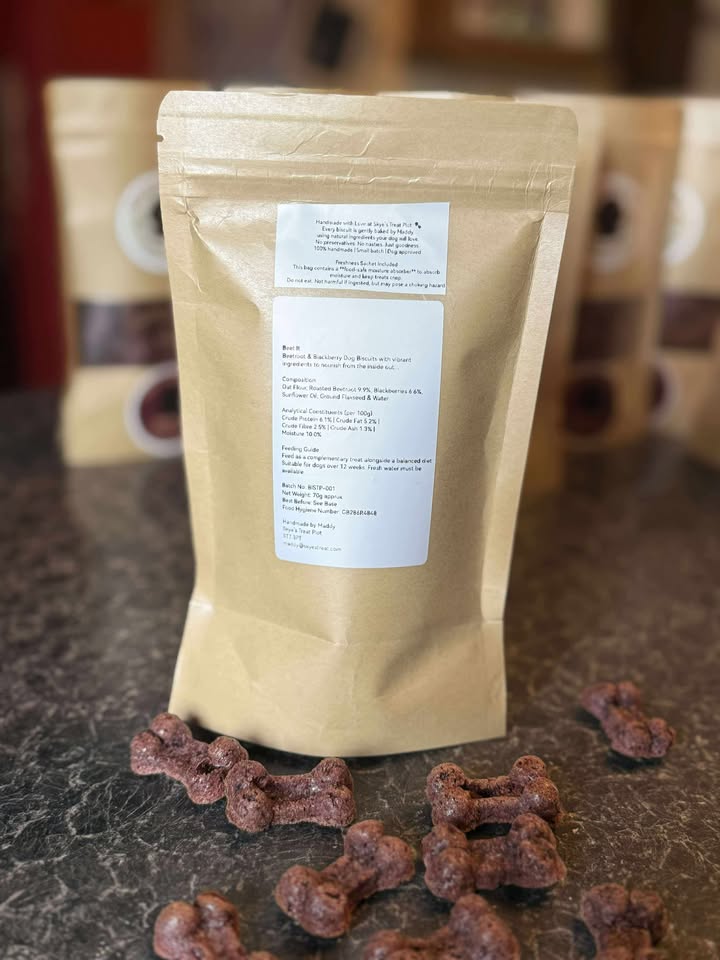 These rich pink biscuits are handmade with fresh beetroot and blackberry to help support your dog’s skin and coat health. Gently baked into chunky bone shapes, they’re crunchy, wholesome, and full of natural antioxidants – with no added fillers, just superfood goodness.